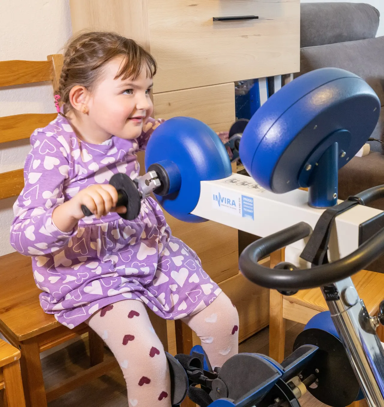 Prudký postup nemoci se sice zastavil, ale odstartovalo kolečko, které je u SMA nutností. „Lítání“ po neurorehabilitacích. Plavání, hipoterapie, tříkolka a další přístroje a terapie. „Ostrava a sanatoria Klimkovice, ježdění pořád dokolečka…“