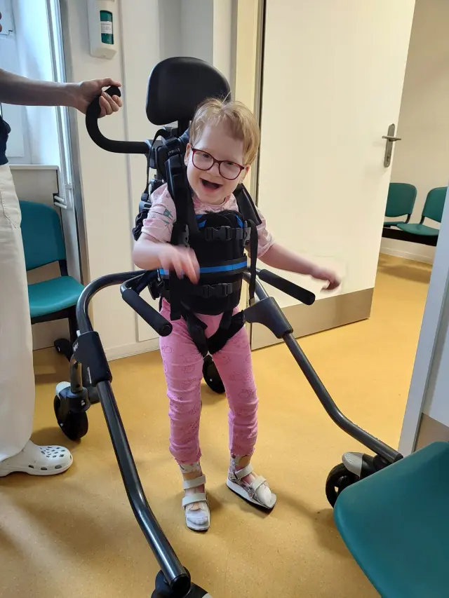 Emminka již má nové auto i s rampou. Nyní hledáme vhodné chodítko. Na fotce Emmi testuje chodítko, které je ze stacionáře a i když to bylo náročné, tak chůze ji velmi baví.