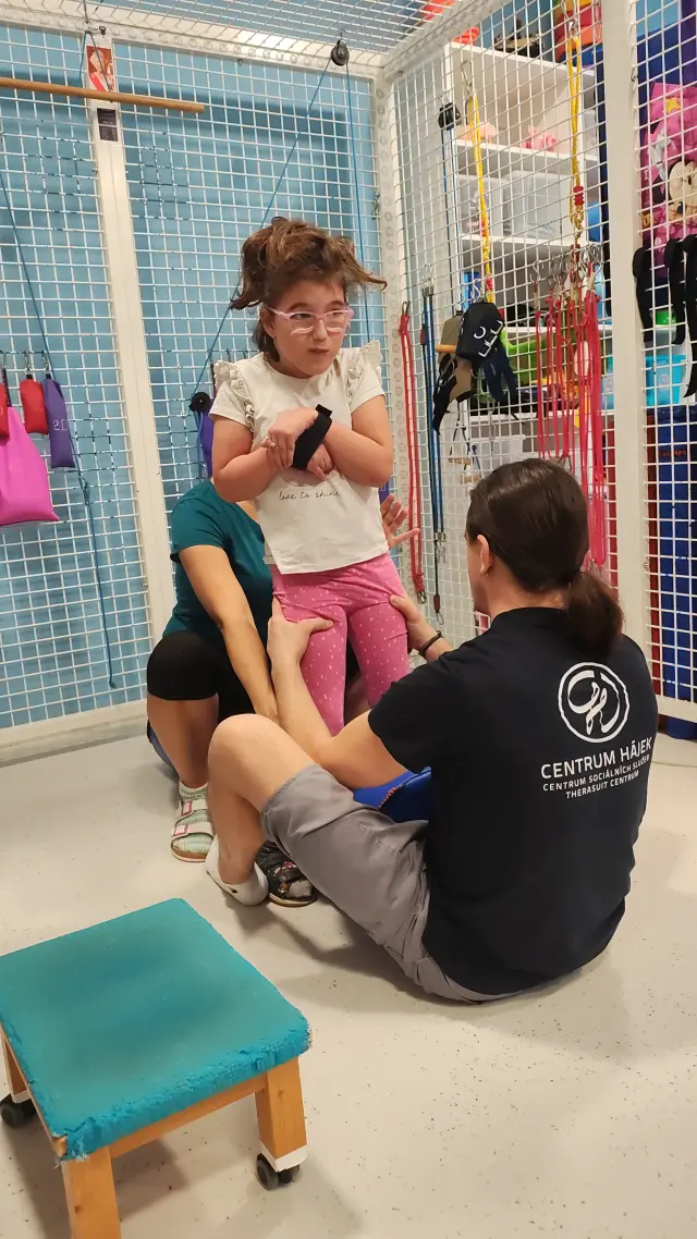 Danielka z Hájku vždy přijede s malým pokrokem, který během zbylých měsíců udržujeme. Problém jsou 4 hodiny ve škole, kde jen sedí a vůbec se nehýbe. Proto potřebuje pobyty intenzivně opakovat.