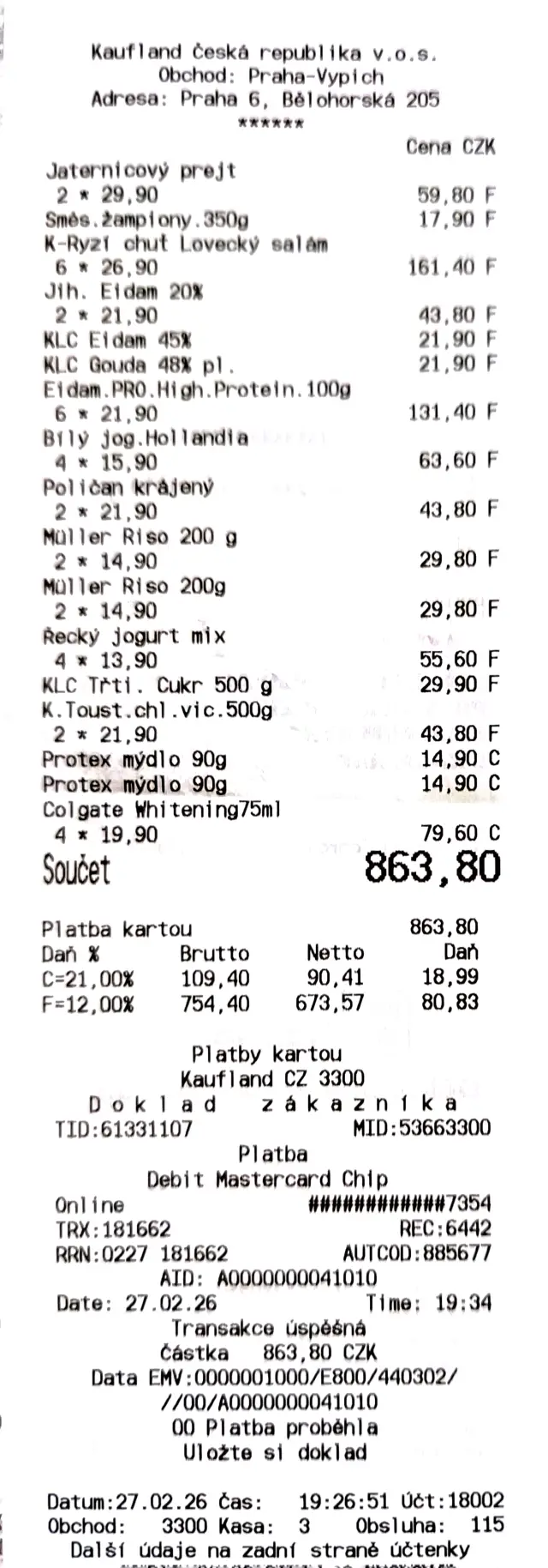 Děkuji dárcům za peníze na jídlo a hygienu. Zatím jsem utratil 863,80 kč.