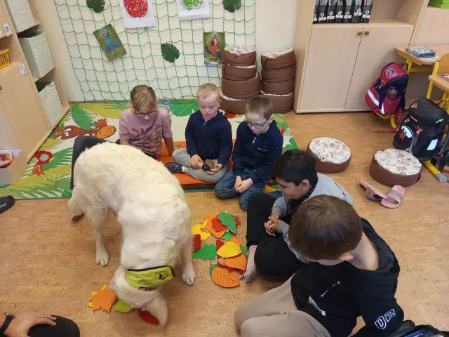 Canisterapie – terapeutické působení speciálně vycvičeného psa pod vedením zkušeného terapeuta – není pro naše děti „jen zábavou“, ale konkrétním a velmi přínosným prostředkem rozvoje. Pes dokáže navázat kontakt i s dítětem, které běžně nereaguje na své okolí. Pomáhá snižovat úzkosti, zlepšuje soustředění, motivuje ke komunikaci a podporuje jemnou i hrubou motoriku. V kontaktu se psem děti zažívají radost, pocit bezpečí i úspěchu – to, co jim v běžném životě často chybí.  Při pravidelných návštěvách canisterapeutického týmu sledujeme výrazné pokroky – děti se více otevírají, reagují na podněty, zlepšuje se jejich nálada i spolupráce při výuce a rehabilitaci. Pro některé z nich je kontakt se psem jediným způsobem, jak navázat blízký vztah a zažít přijetí beze slov a bez posuzování.