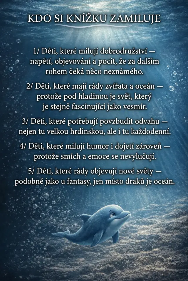 Lucky je nejmenší delfín ve třídě. Poslední v závodech. Ten, kterému říkají, že je moc slabý na velký svět. Jenže když zaslechne zakázané jméno a pochopí, že příběh jeho rodiny není takový, jak mu celý život vyprávěli. Že mu dospělí spoustu věcí tajili, že jeho vlastní minulost je spojená s Temným krajem, rozhodne se porušit všechna pravidla.