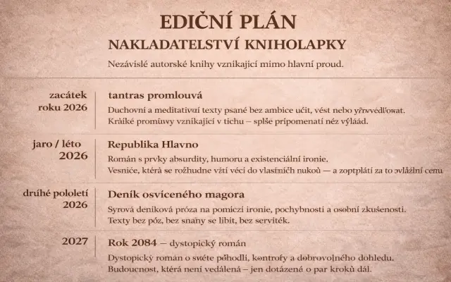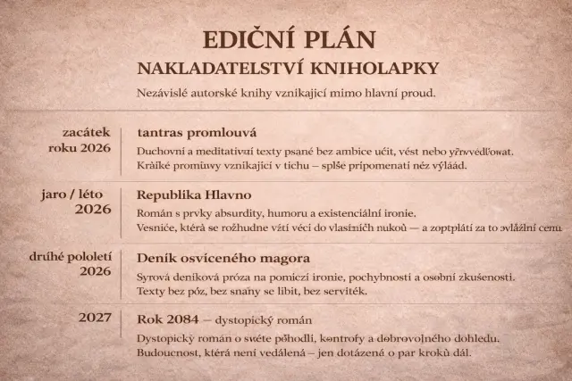 Chci vydávat knihy, které vznikají mimo velké vydavatelské domy — svobodně, bez tlaku na trendy, s důrazem na autorský hlas a originalitu.