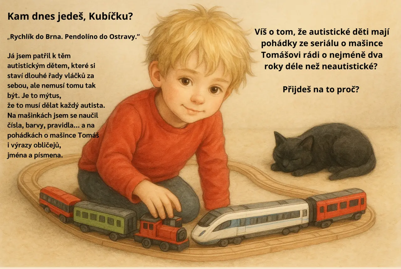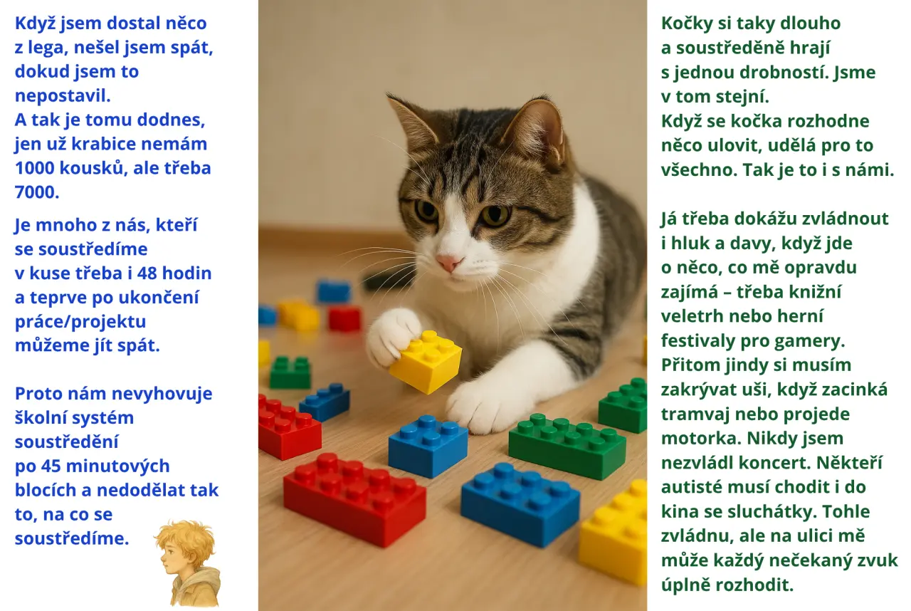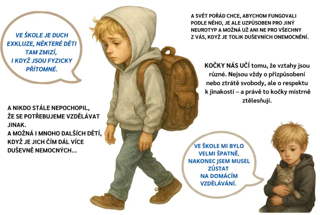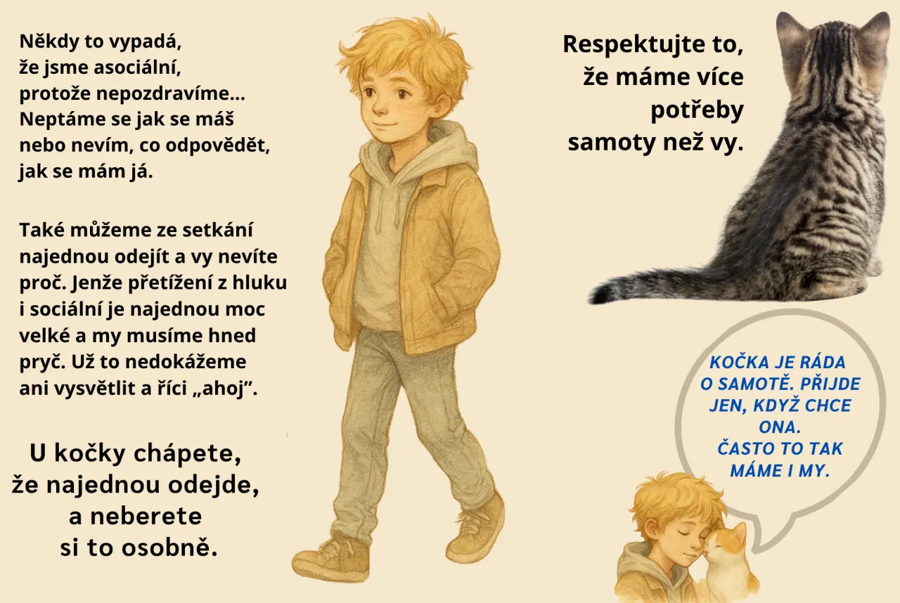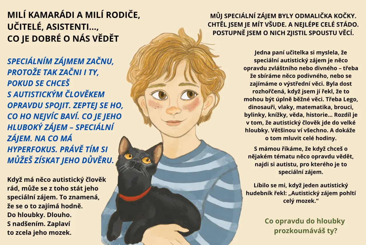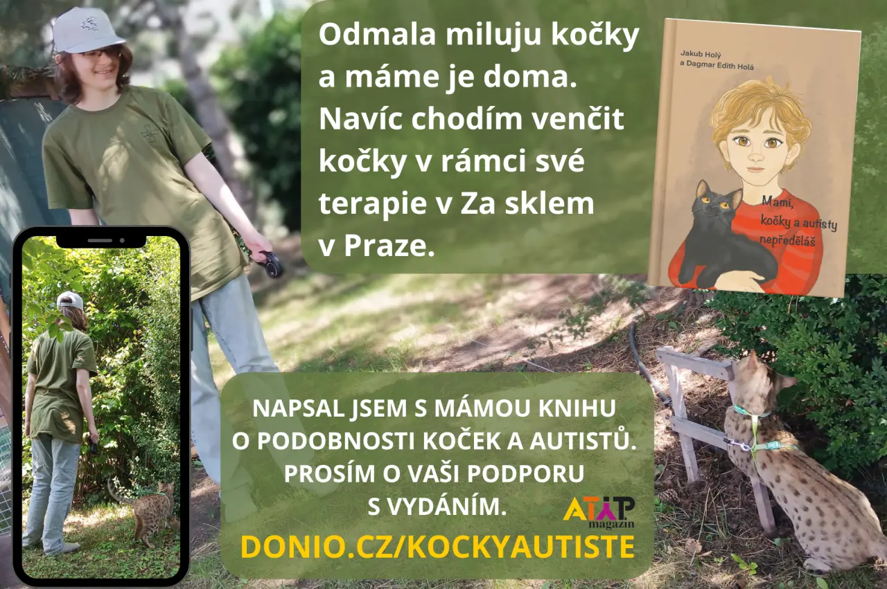 Jednou jsme dostali za úkol připravit projekt o inkluzi. Nevěděl jsem, kde začít, ale pak mě napadlo vysvětlit spolužákům, co mají kočky společného s autisty. Doma jsem vytvořil 14 slajdů – a když je viděla máma i paní učitelka, řekly, že by z toho mohla být kniha. Prý jim moje postřehy řekly víc než některé odborné knihy o autismu.