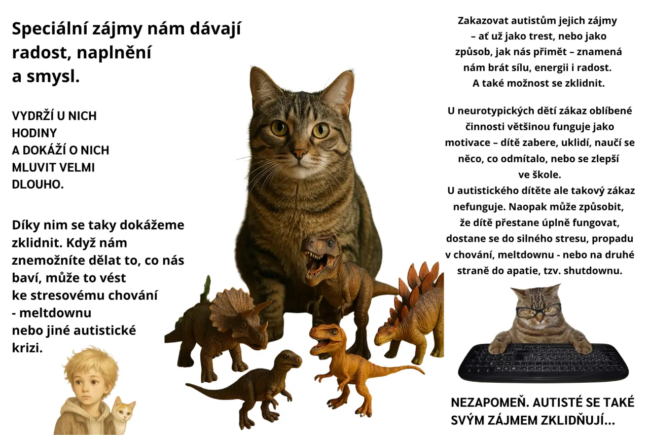 Ve škole věděli, že kočky jsou můj speciální zájem. Když znáte speciální zájem autistického člověka, můžete s ním lépe komunikovat a získat jeho důvěru. Mně pomáhalo, když jsem mohl psát slohy a jiné úlohy o kočkách a dělat projekty na tohle téma.