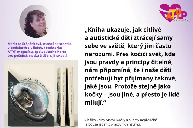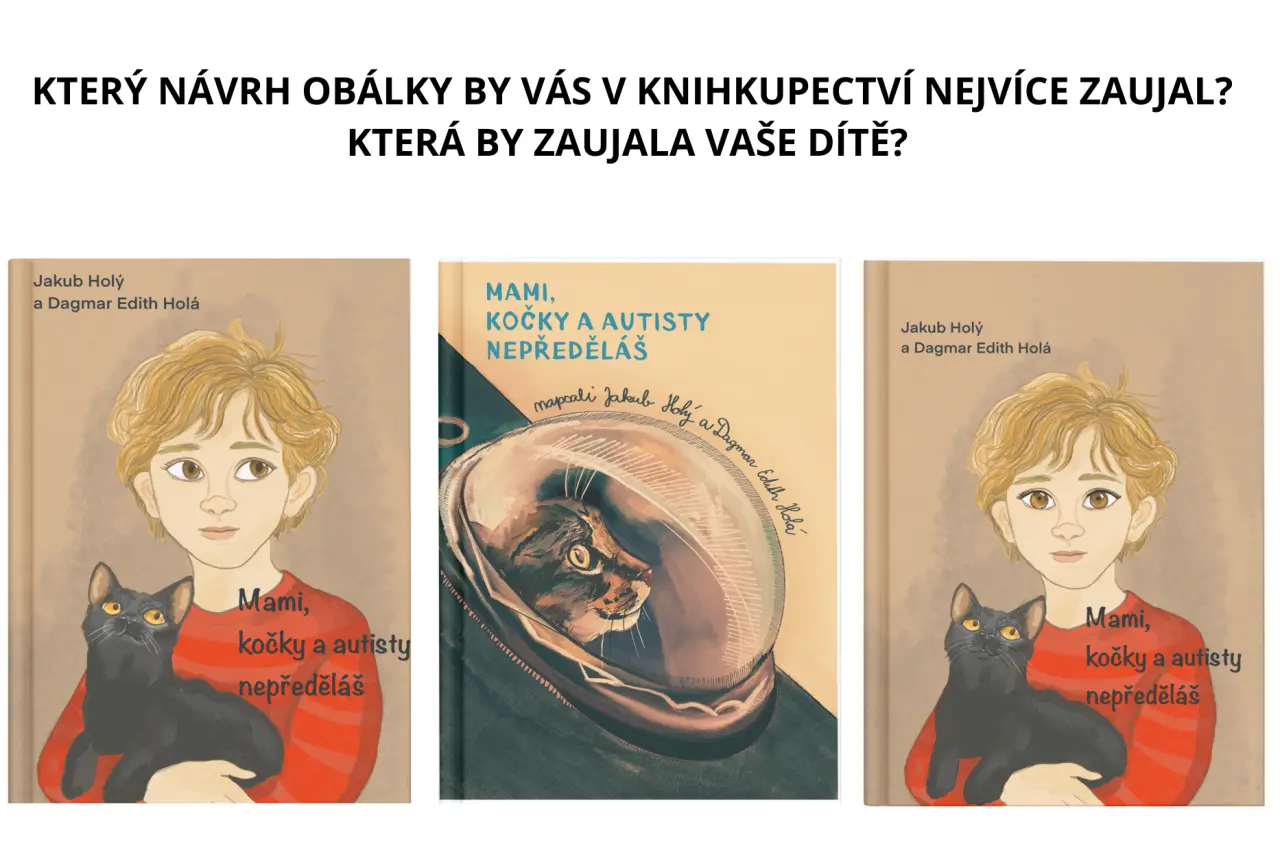 Postupně vám představím nejen více sebe, mámu, naše kočky, ale i naši společnou knihu „Mami, kočky a autisty nepředěláš”, kterou bychom díky vám rádi vydali. Najdete zde také ukázky pár stránek – jsou to pracovní návrhy. Finální grafika by měla být od ilustrátorky Kateřiny Šturmové. Zatím je od ní pouze ilustrace pro obálku knihy.