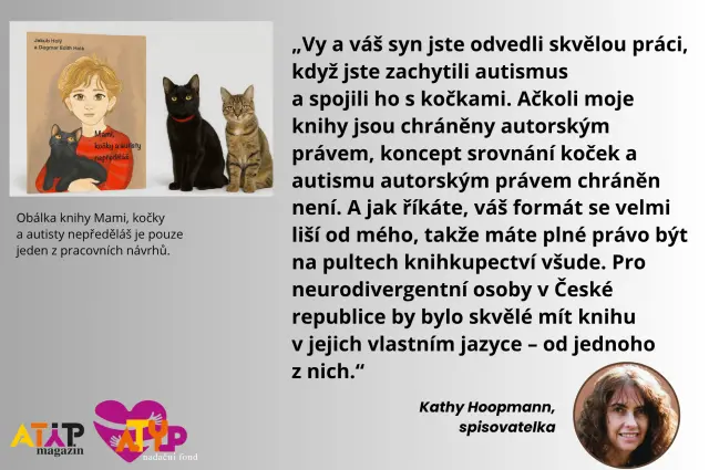 Nechtěli jsme být nařčeni z plagiátorství. To bych nepřežil. Nemám rád čítování. Když jsme objevili, že existuje kniha All Cats Have Asperger Syndrome od Kathy Hoopmann, napsali jsme jí email a v něm jsme jí poslali přeložených 12 stran na ukázku i s Katčinými ilustracemi. Odpověděla nám: „Vy a váš syn jste odvedli skvělou práci, když jste zachytili autismus a spojili ho s kočkami. Ačkoli moje knihy jsou chráněny autorským právem, koncept srovnání koček a autismu autorským právem chráněn není. A jak říkáte, váš formát se velmi liší od mého, takže máte plné právo být na pultech knihkupectví všude. Pro neurodivergentní osoby v České republice by bylo skvělé mít knihu v jejich vlastním jazyce – od jednoho z nich.“ (anglicky psala: “You and your son have done a great job capturing autism and relating it to cats. Although my actual books are copyrighted, the concept of comparing cats and autism is not copyrighted. And as you say, your format is very different from mine, so it has every right to be on bookshelves everywhere. … It would wonderful for neurodivergents in the Czech Republic to have a book in their own language by one of their own.”)