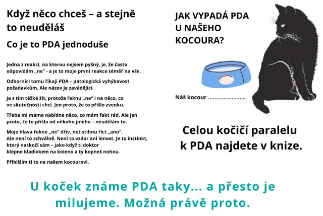 Mámina část je spíš pro dospělé – pro ty, kteří pečují o autisty a kočky. Třeba pro rodiče, učitele, asistenty, odborníky, ale i pro dospívající a dospělé na spektru autismu. Vysvětluje pojmy jako speciální zájem a smyslové přetížení. Představí vám tajné ale důležité smysly – o kterých se nemluví. Píše hodně o maskování, autistickém vyhoření, autistické krizi (shutdown, meltdown) nebo o u nás málo známém profil PDA (patologická vyhýbavost požadavkům). A to vše jsme se snažili i popsat přes kočičí svět. Máma to píše jako někdo, kdo dělá dlouho osvětu, pracuje s lidmi na spektru autismu – a sama je také. Pořád bojuje za spravedlnost jako Don Quijote, to je dost autistické:-)