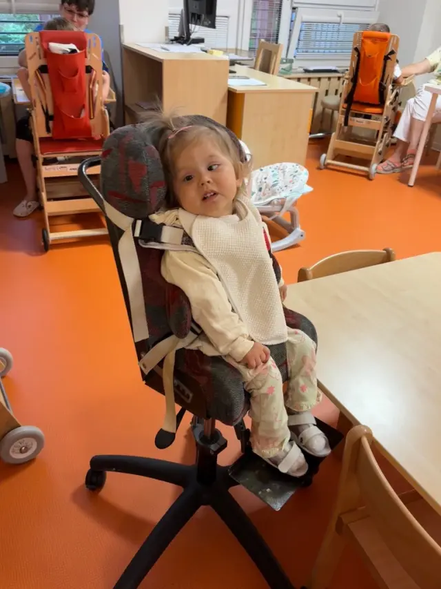 Máme doma vertikalizační stojan,který jí umožnuje správně sedět i stát, je díky němu více interaktivní.