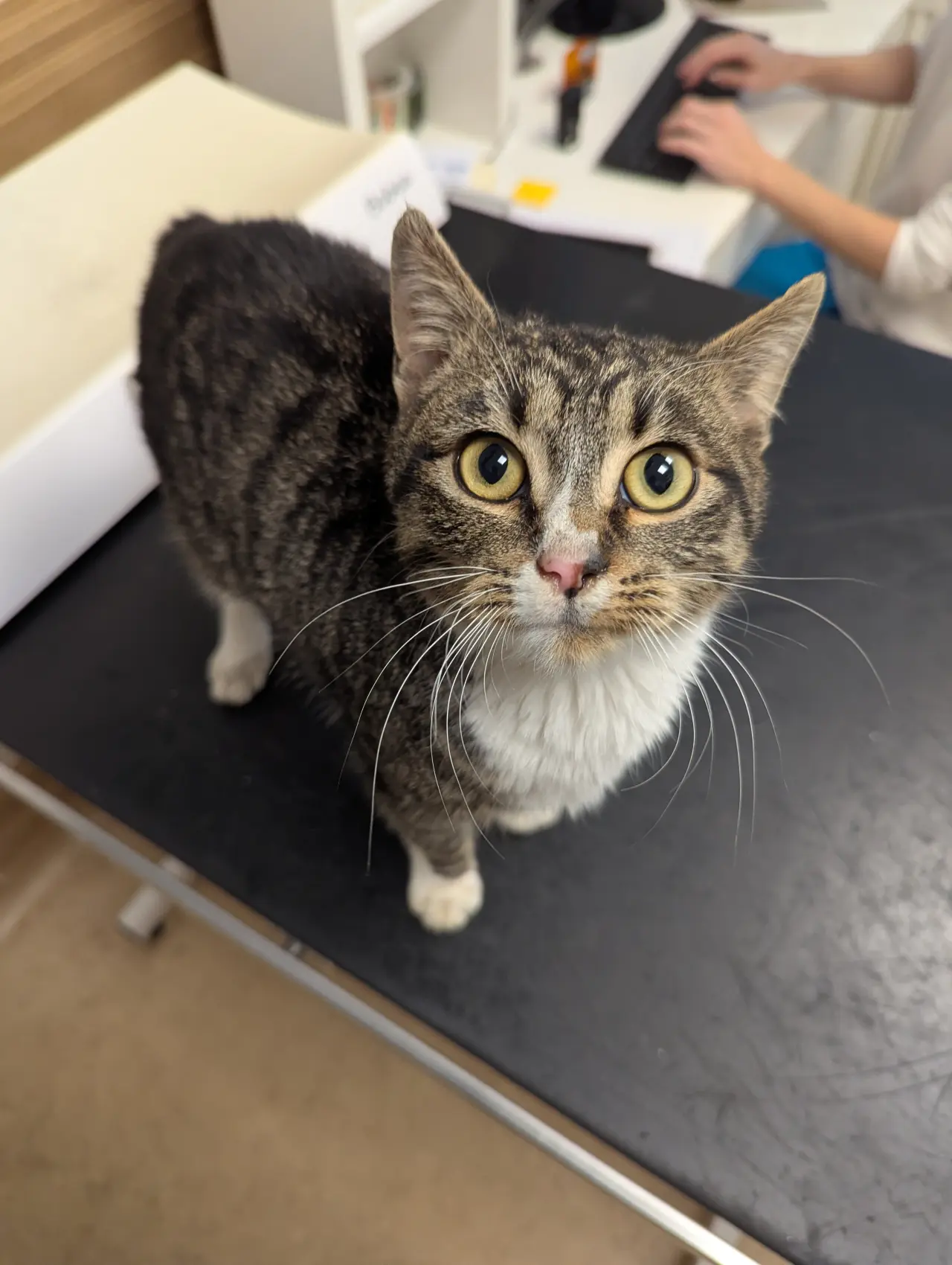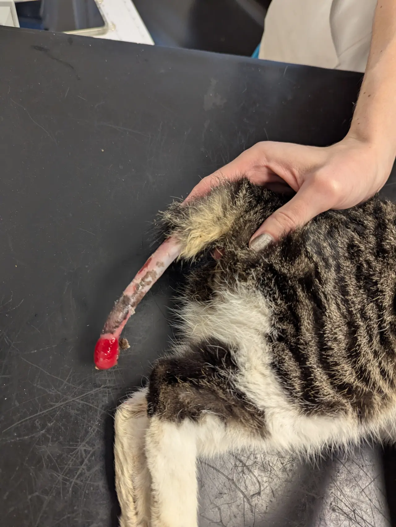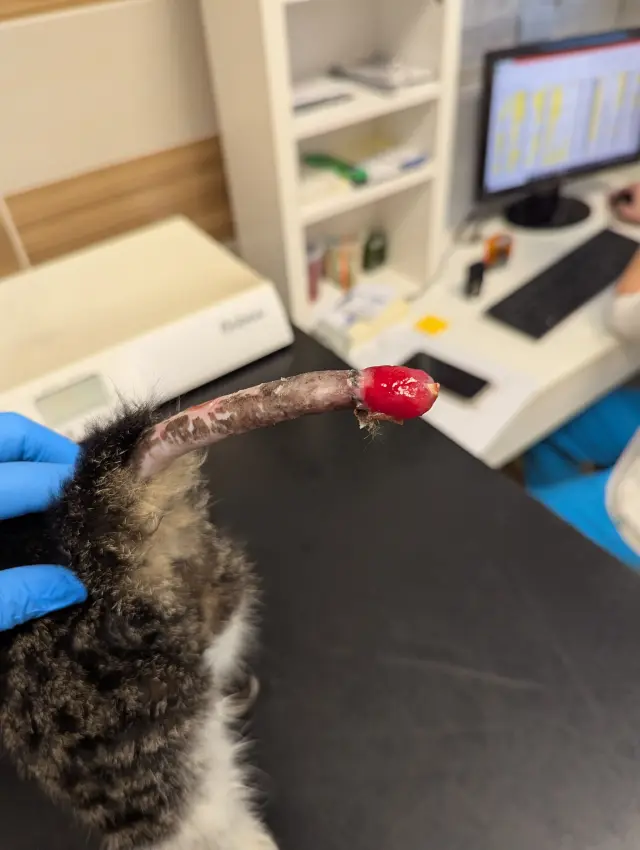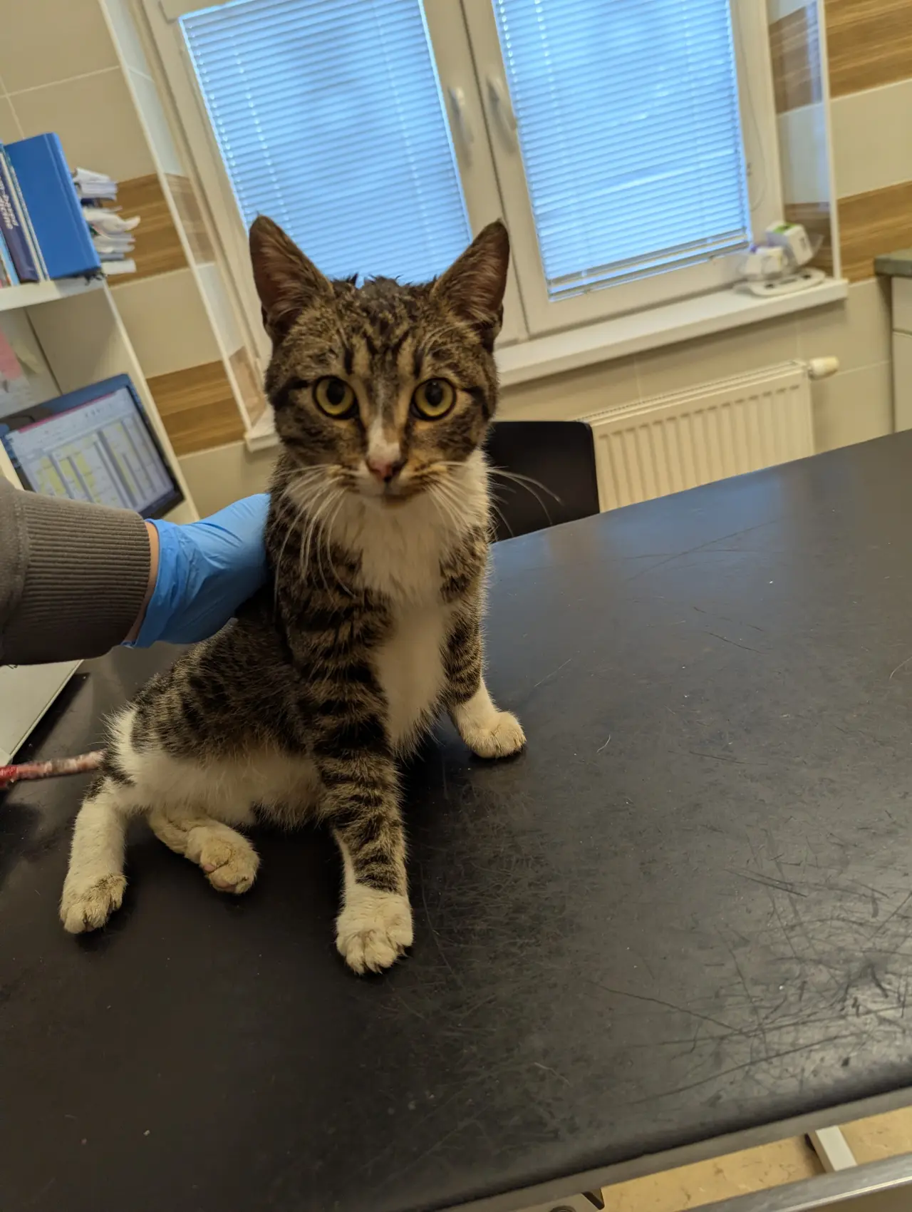 Kocourek Kryštof se k nám dostal za velmi dramatických okolností. Byl nalezen ve školce v obci Radostná pod Kozákovem s vážným zraněním ocasu. 😞 Velká část ocasu mu chyběla a na jeho konci vyčnívala kost. Jeho stav byl kritický a bez okamžité odborné pomoci mu hrozila sepse.