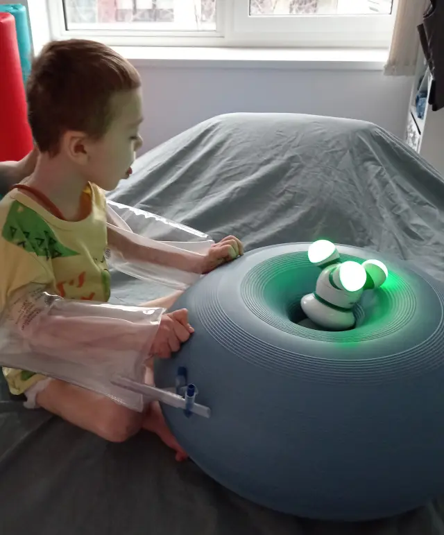 Thanks to regular exercises, he can now hold his head and torso upright more often.