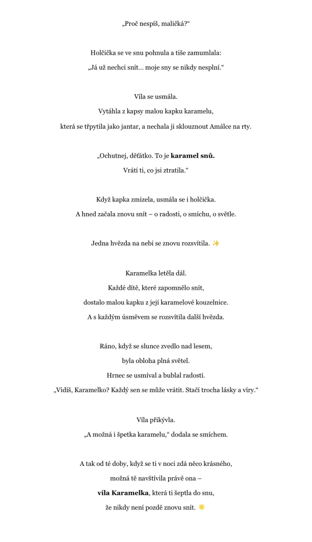 Vzniká pohádková knížka na dobrou noc s názvem O Víle Karamelce.