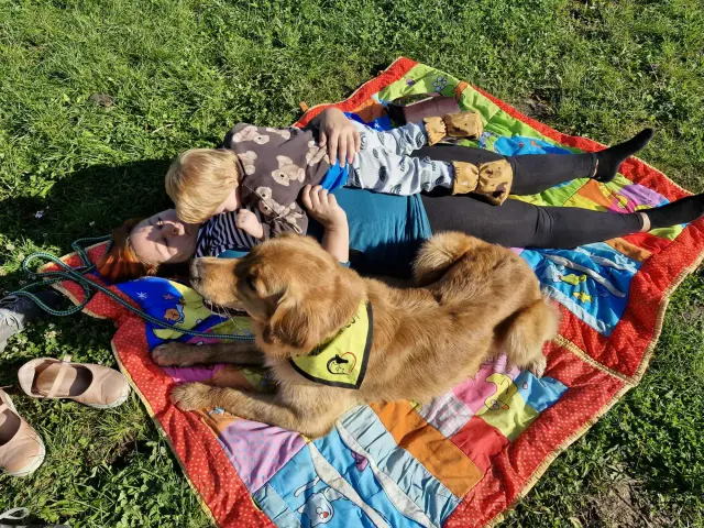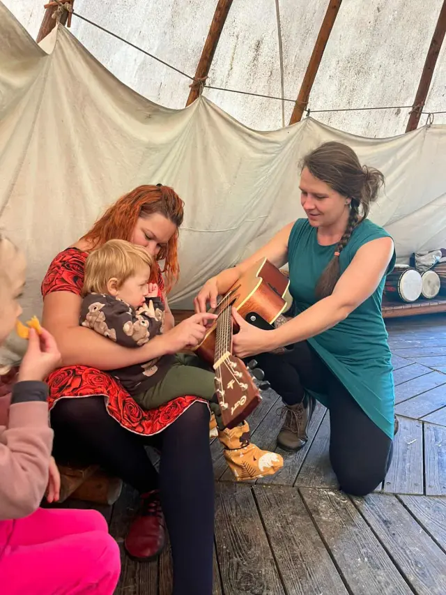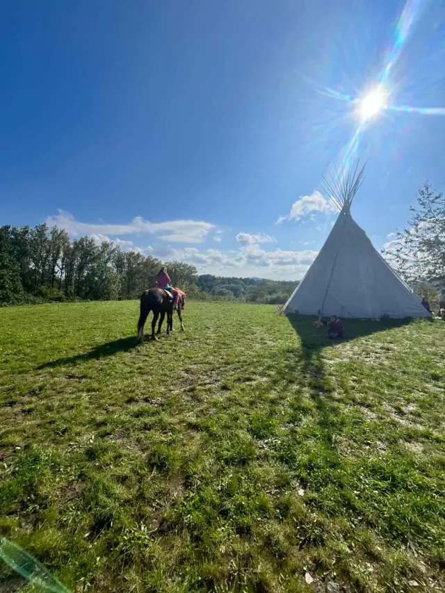 Dobrý den. Díky vaší podpoře jsme mohli absolvovat pobyt pro pečující, který byl pro nás všechny obrovským přínosem. Děti měly 2× hipoterapii nechyběla ani muzikoterapie a canisterapie a právě muzikoterapii si v neobvyklém prostoru a to tee pee užili i rodiče.