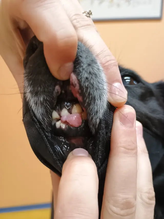 Při vstupním veterinárním vyšetření se ukázalo, že má nádory na mléčných žlázách na obou stranách – dva větší a několik drobných. Pravděpodobně bude potřeba odstranit celou jednu lištu a i část té druhé, což znamená dvě operace. Zároveň bude při prvním zákroku provedena kastrace. Navíc trpí výrůstky na dásních (epulis), které jí překážejí v tlamě a také hrozí, že se z nich časem může zvrtnout něco zhoubného.