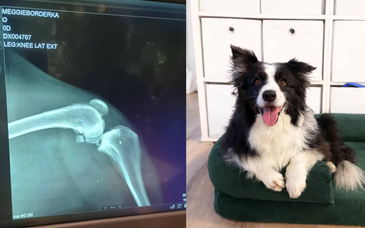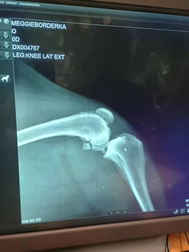 Při ortopedickém vyšetření se potvrdilo to, čeho jsme se obávali – přetržené kolenní vazy na pravé noze, navíc s poškozenými menisky. Koleno je oteklé, s výpotkem, a na RTG jsou již patrné známky artrózy typické pro delší dobu neléčenou rupturu vazů. Odhadujeme, že Meggie bolest snáší už týdny, možná měsíce.