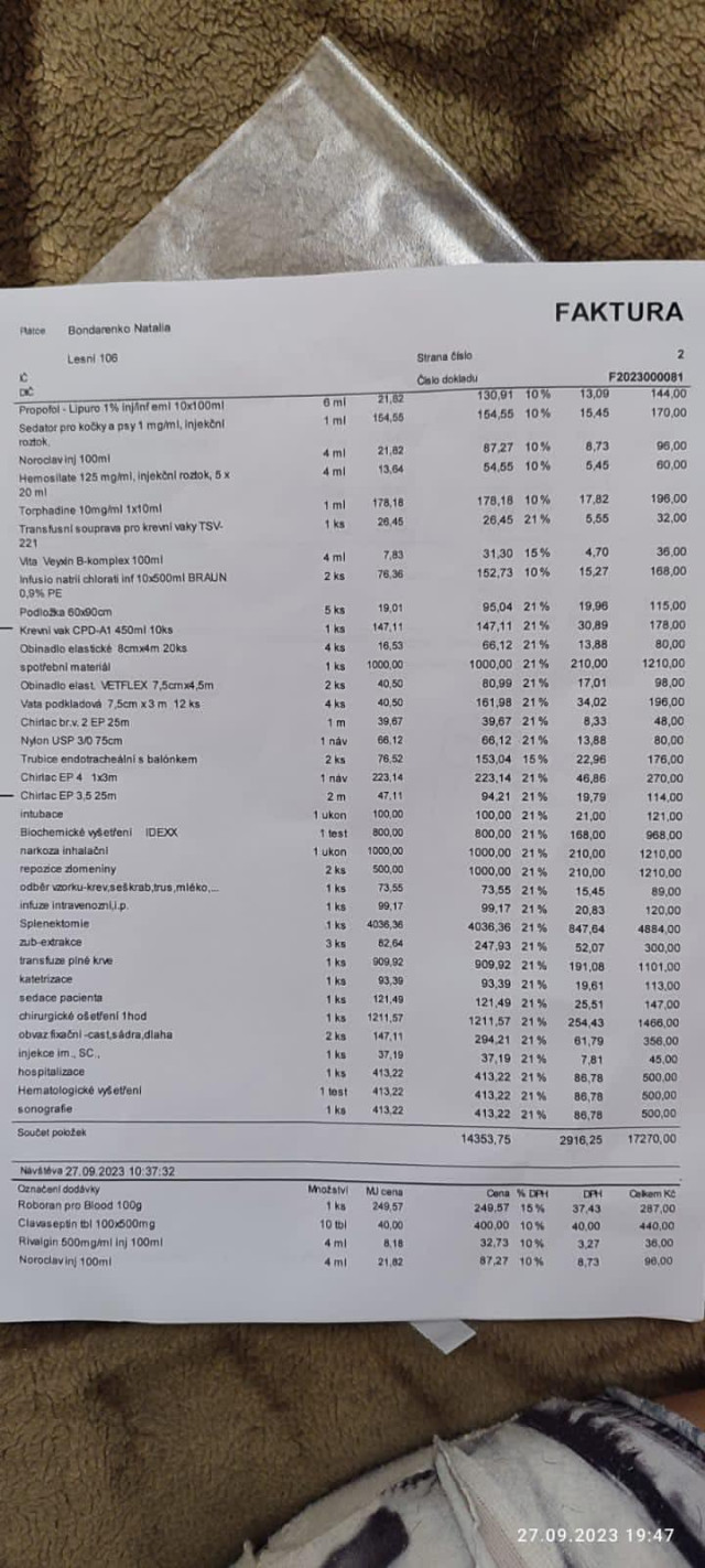 Dobrý den, jmenuji se Pavel Brabec a rád bych prostřednictvím sbírky pomohl své Ukrajinské kamarádce. Milovaný pes mojí Ukrajinské kamarádky Natalia Bondarenko „Ričik“ měl 25. 9. nehodu. Spadl z balkonu v druhém patře. Ubytovna kde Natalie bydlí má v havarijním stavu balkony a hrající si děti jenž „Ričika“ chtěli vidět přivolávali jej ze zahrady a netušili co způsobí,pod tlapkami Ričika praslo zábradlí a pes vypadl z druhého patra.Následkem pádu si zlomil obě přední tlapky, utrpěl silný otřes mozku, četné pohmožděniny, vyrazil si 2 přední zuby, roztrhl jazyk a horní část tlamy, také se při vyšetření u veterináře zjistilo, že má nádor na slezině a při pádu začal krvácet. Dne 26.09 podstoupil operaci, při které mu byla odstraněna slezina, na jazyk mu byly přiloženy stehy, nádor byl odeslán do laboratoře na histologii, na tlapky mu byly přiloženy speciální obvazy a byla mu podána transfuze krve. Je při vědomí, nádor se ukázal jako nezhoubný, 27.09 byl odvezen domů. Čeká ho nejnáročnější operace tlapek, která bude provedena až po zahojení dutiny břišní po operaci. Prosíme o pomoc pro našeho milovaného pejska. Léčba, pobyt na klinice a operace jsou velmi nákladné. Čeká ho dlouhá cesta k uzdravení. Ričik není jen obyčejný pes, je to člen naší rodiny. Přežil válku na Ukrajině, respektive přežil bombardování ve městě Mariupol. Během války, když v březnu 2022 žili několik týdnů ve sklepě, hřál Natálii i s její dcerou svým teplem. Pomáhal vyhrabávat lidi, když se dům zřítil.V Mariupolu rodina přišla prakticky o vše.Nyní jsouv České republice sami,Natalie a její dcera, bratři a manžel zůstali na Ukraině. Moc vás prosím, abyste jim pomohli s financováním Ričikovi operace. Dejte Ričikovi šanci na život. Za tři dny jim klinika naúčtovala 24 776 korun.Tuto částku se nám podařilo vybrat mezi přáteli a známými,jenž Natalii měli možnost, během roku a půl,kdy žije v České republice poznat.Je to úžasná a pracovitá žena. Další operace jeho tlapek bude stát asi 40000–50000 korun. Bohužel Natalie s dcerou,jenž je na mateřské dovolené tolik peněz nemají, ale moc chtějí, aby Ričik žil. I když Natalie pracuje a dělá k hlavnímu zaměstnání brigády,není schopna na operaci našetřit.Pomozte jejímu Ričikovi žít!