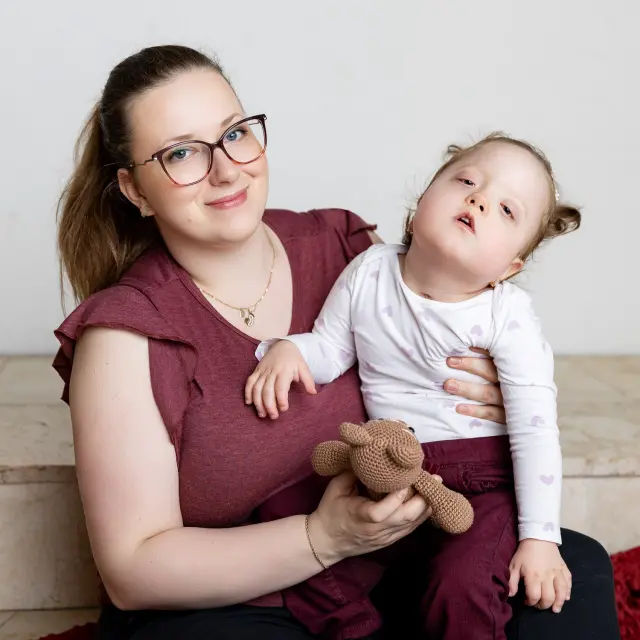 Adélka má výrazně opožděný psychomotorický vývoj, má centrální hypotonický syndrom, poruchu autistického spektra, reflux, chybějící sací a polykací reflex a je krmena stříkačkou přes PEG (hadička do bříška).