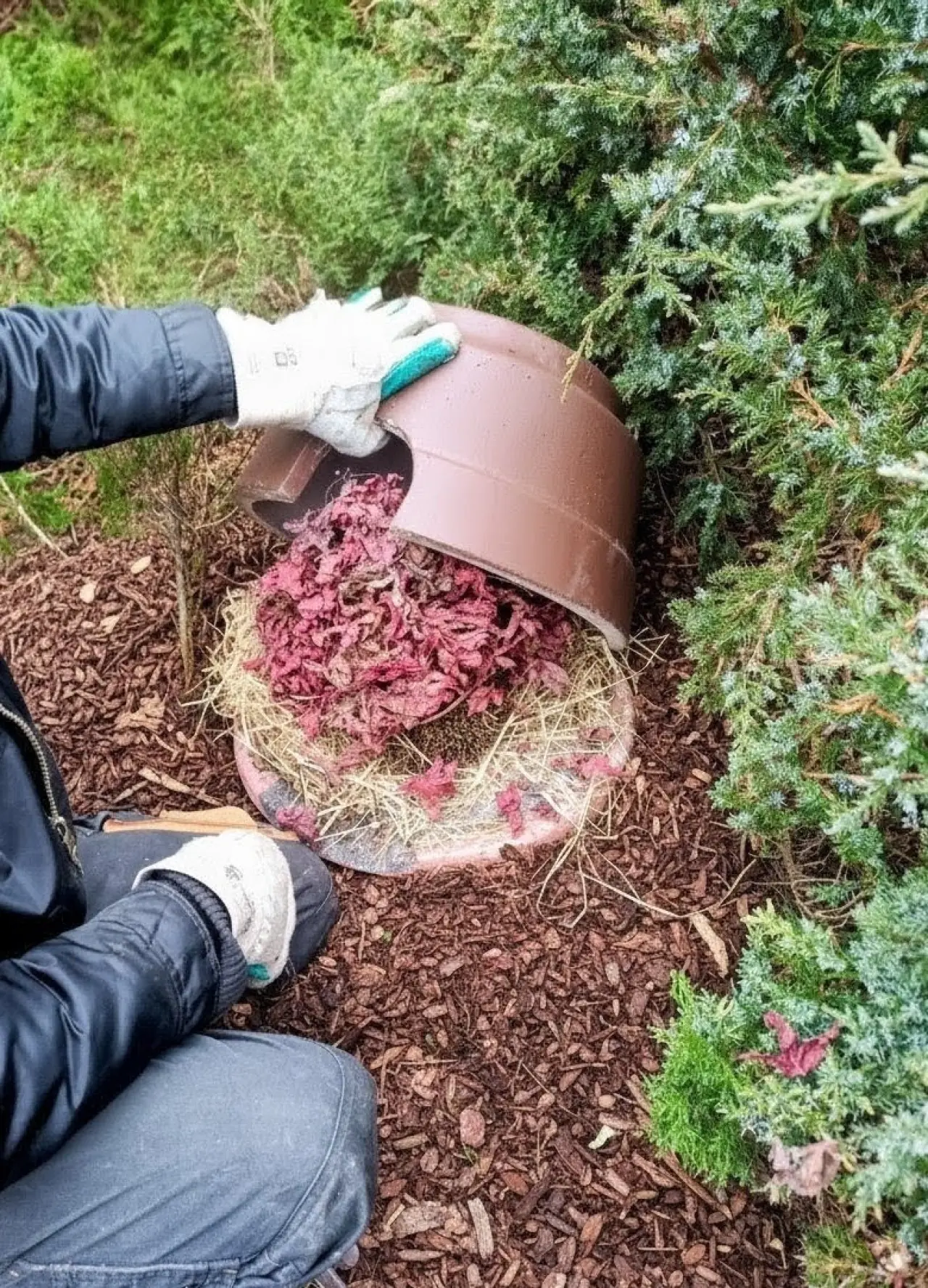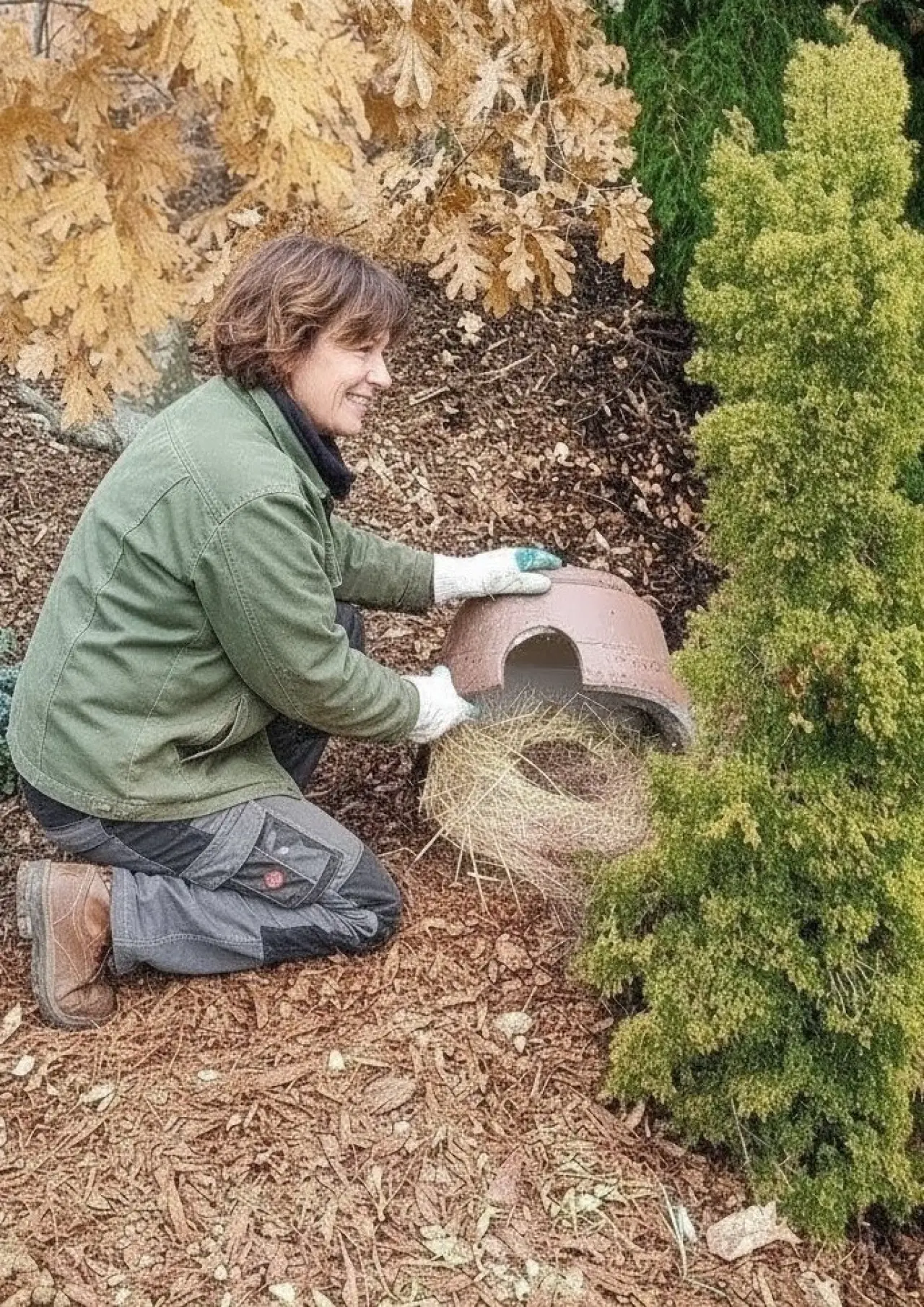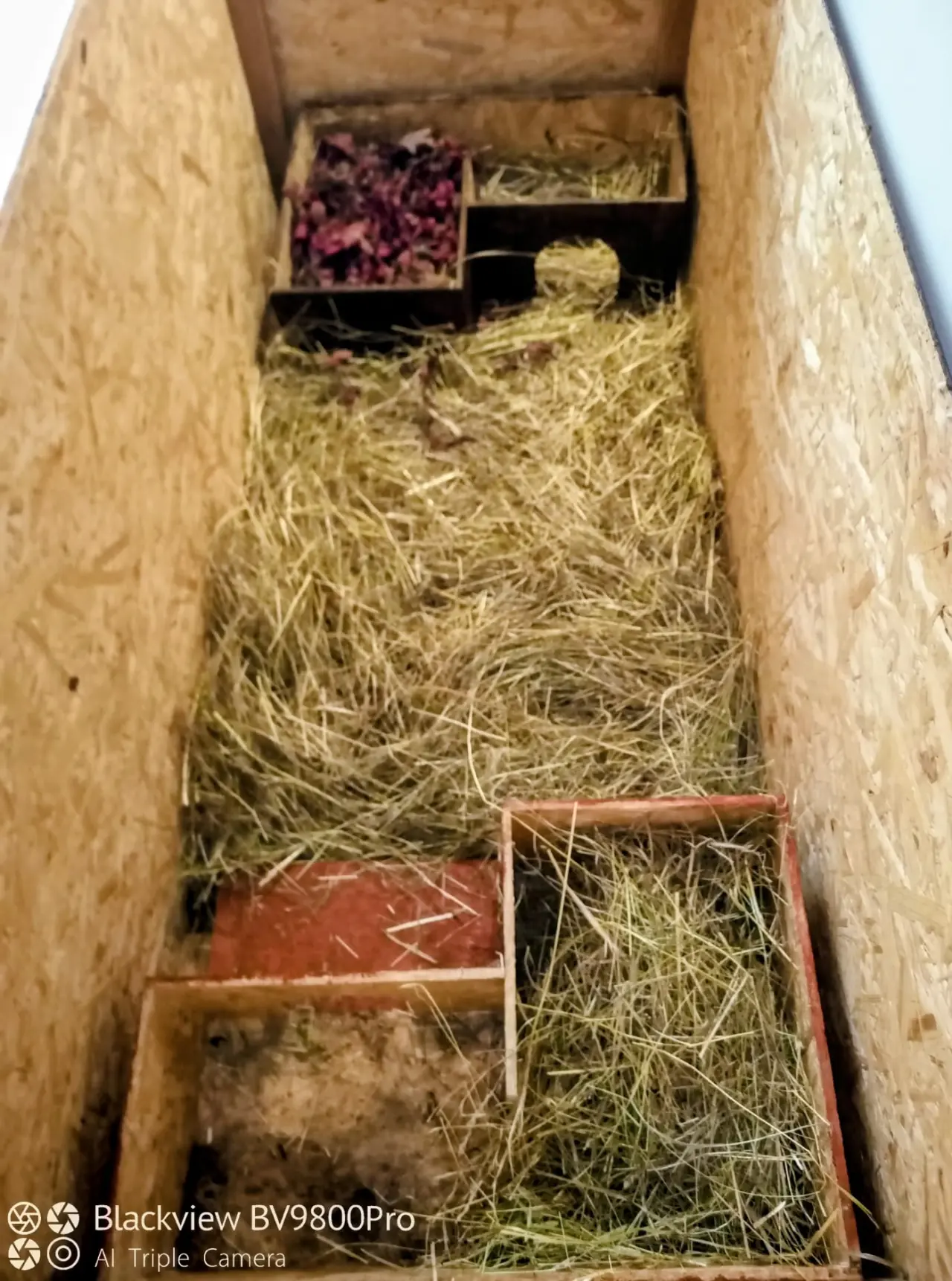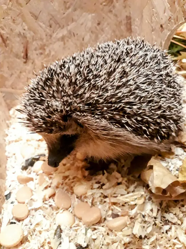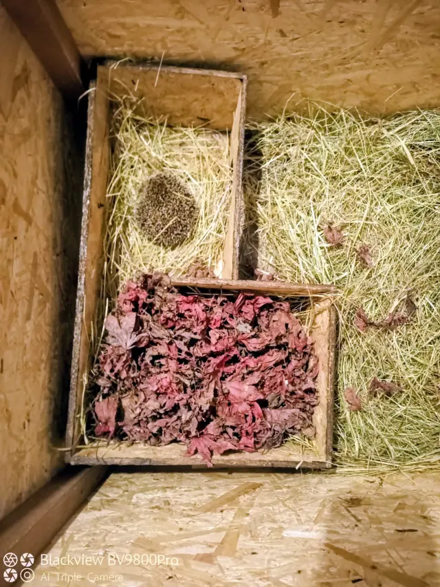 Ježci jsou dokrmováni v teráriu s domky uvnitř, které jsou kryté střechou, ale aby jste viděli interiér domečků jsou střechy na chvíli sundány stejně jako během čištění.