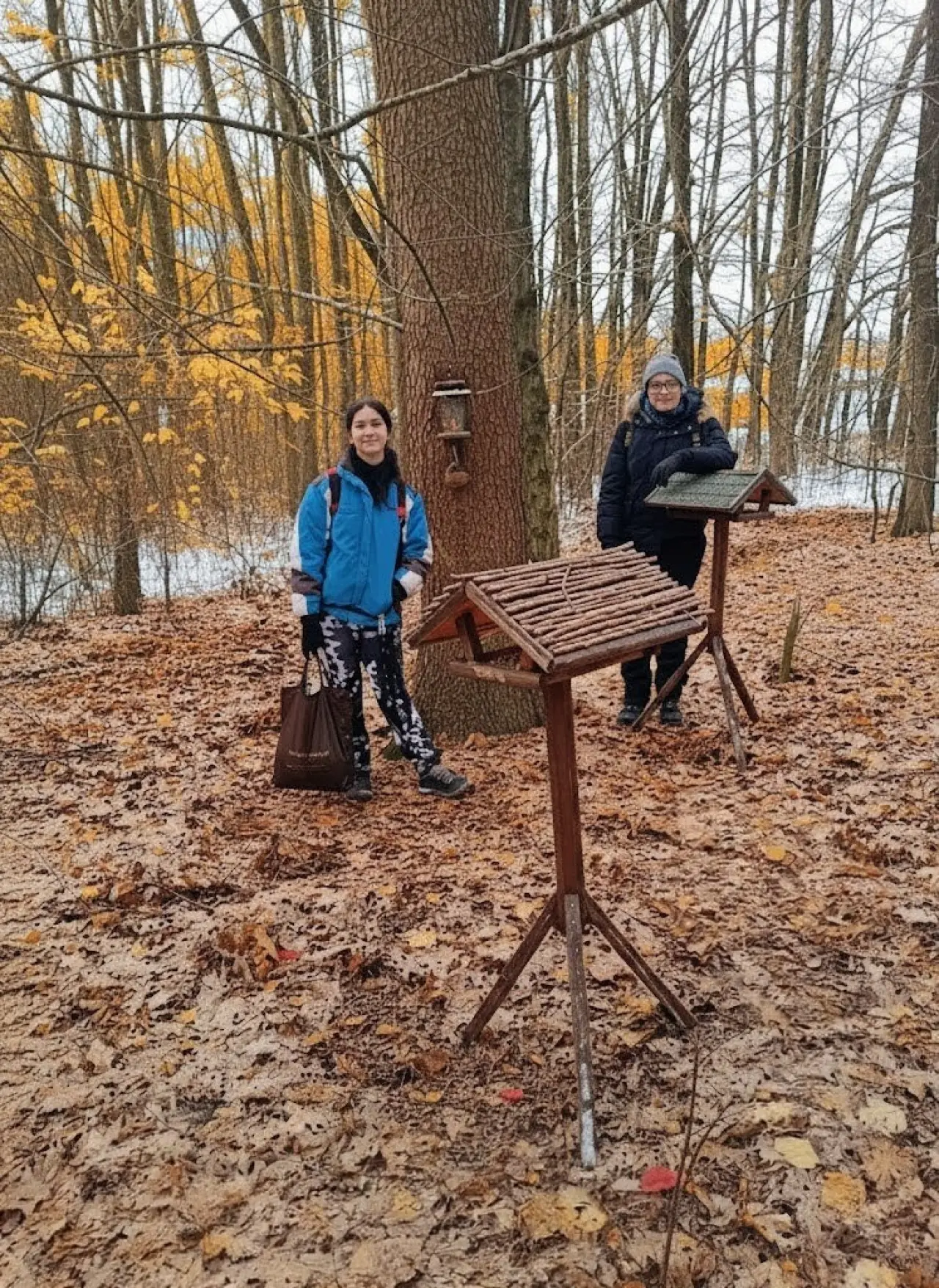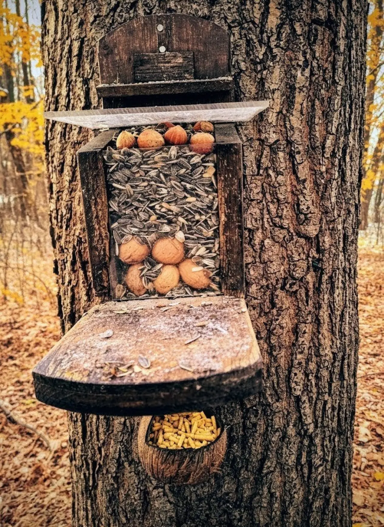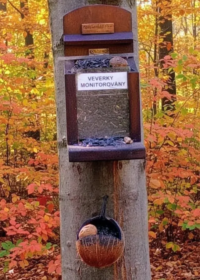 Jedno ze třiceti krmných míst v okolních lesích pro veverky.