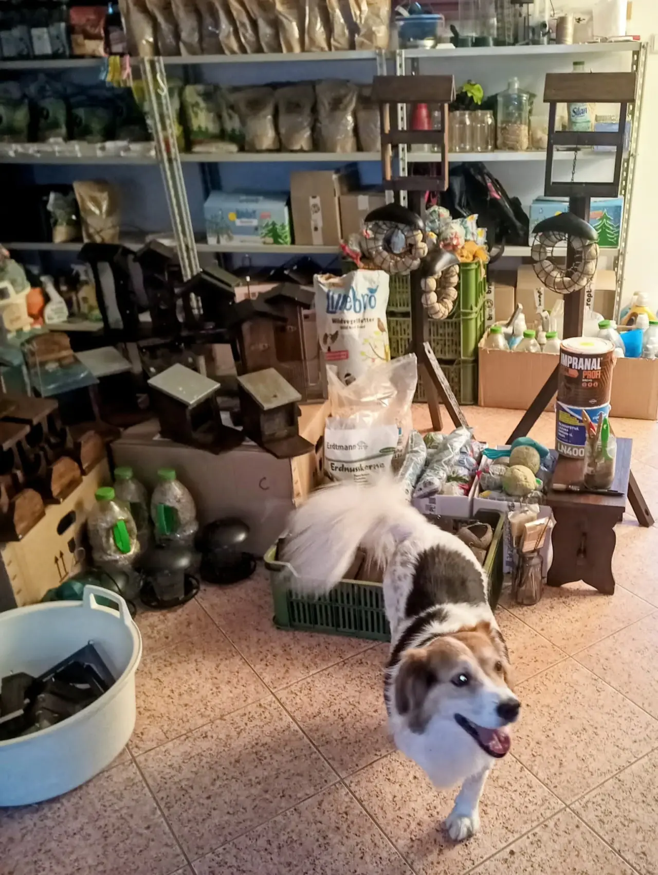 Pohled do našeho skladu v nedávné době příprav – natírání a opravy krmítek, vybalování zatím částečných zásob krmiva.