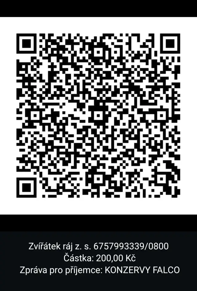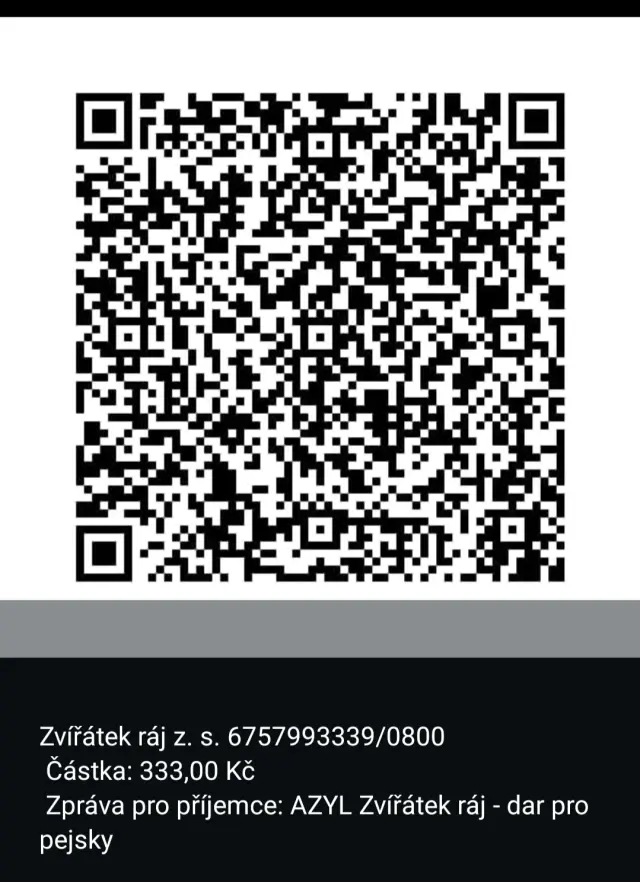 Transparentní účet: 000000–6757993339/0800QR kód „DAR PRO PEJSKY“. Částku lze měnit všemi směry a na vyžádání pošleme potvrzení o daru pro daňové úlevy. Pište na zviratek.raj@seznam.cz🙏