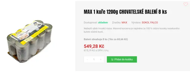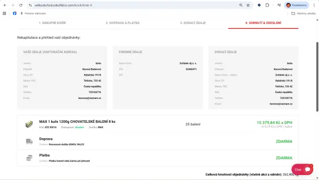 🔴Konzervy Sokol Falco (16 531 Kč): Máme rezervaci na druhou část dodávky = dalších 30 balení dietních kuřecích konzerv (celkem 240 ks). Tato částka bude hrazena v hotovosti při převzetí příští týden.
