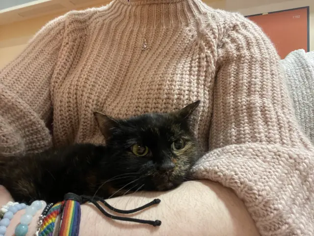 Aya je tříletá, jemná a klidná kočička, která se nejraději schoulí vedle člověka a přede. Navenek působí zdravě, a o to hůř se smiřuje s tím, že dlouhé měsíce skrývala bolest, kterou sama neuměla ukázat.