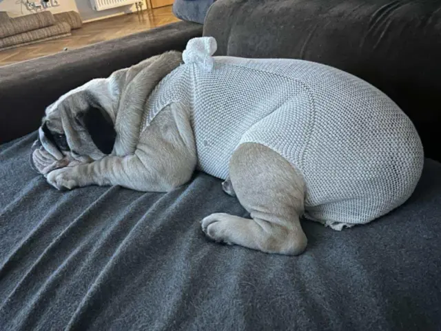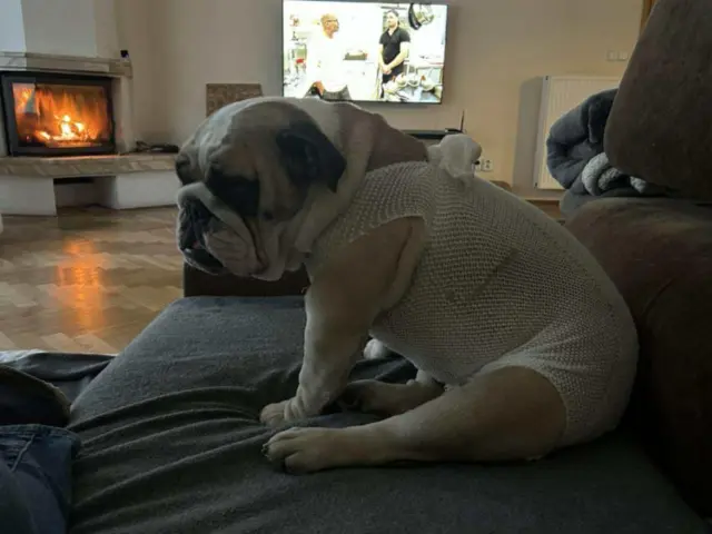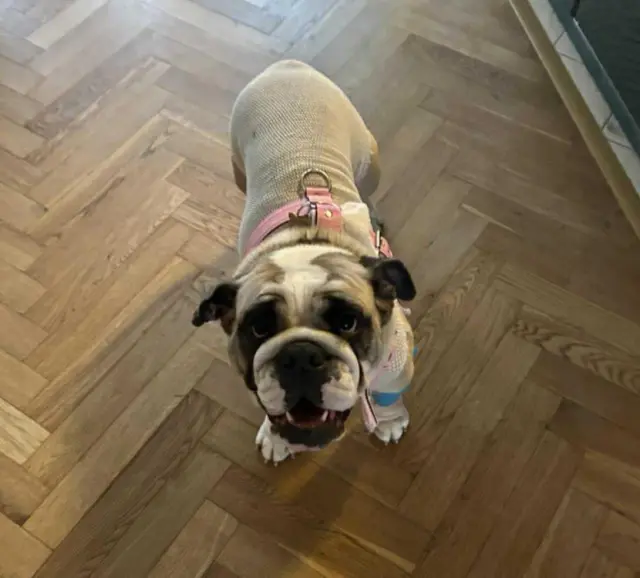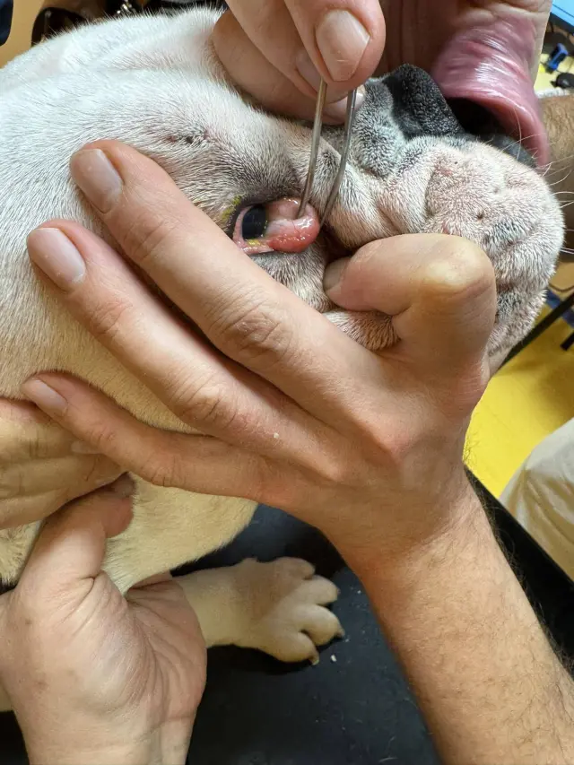 Kuky je větší, bílá anglická buldočka, která je hluchá a má závažný problém s levým okem. Trpí masivním výhřezem Harderovy žlázy třetího víčka, zároveň má entropium – tedy vpáčené víčko, jehož řasy oko neustále dráždí. V oku má také chronický zánět,
