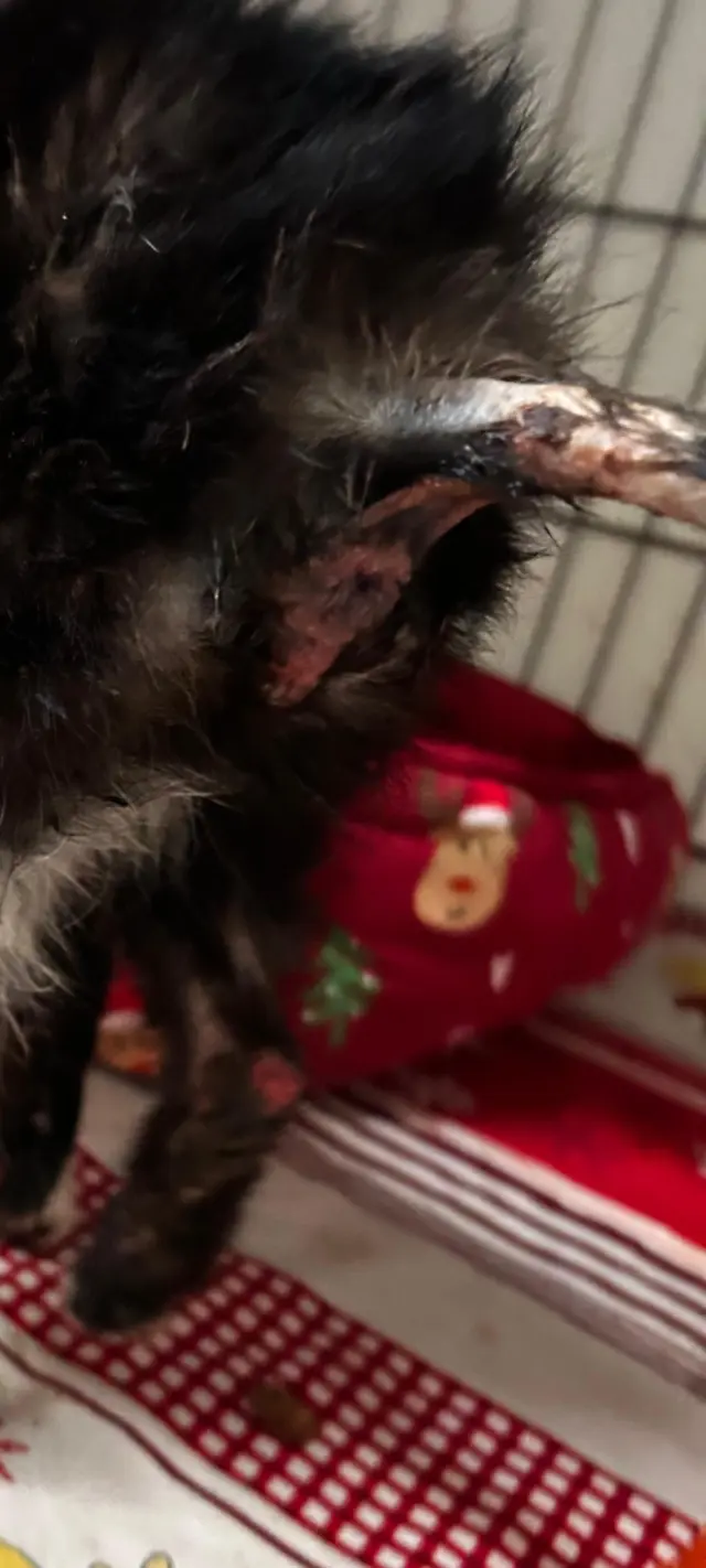Neděle 15.2, venku krásný náznak jara a optimismu. U našich útulkových dveří se ozval zvonek a kolegyně Klárka počítala s někým, kdo nevydržel čekat na termín návštěvy k adopci a vyrazil neohlášen.Bohužel za dveřmi našla šílenost, až to vhání slzy do očí. V přepravce, znečištěné výkaly za určitě několik dní, zuboženou kočičku pouze potaženou kůží. Ani pohlaví zatím nelze určit, jak má srst kolem zadečku slepenou, vše podebrané. Zadní pacičky už jí bakterie a červy začaly rozežírat do krve. Brouček na sobě nemá ani gram tuku a žádný silnější sval, musela být zavřená o hladu a se silnými průjmy už delší dobu. Má jen 1,6kg.