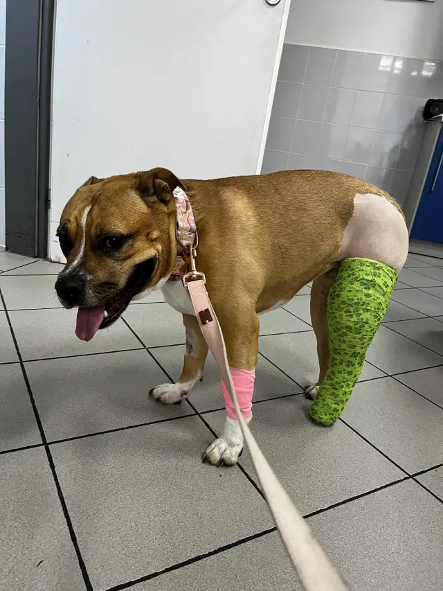 Ahoj milí dárci, tak už se vám můžu konečně ukázat🐕. Mám první operaci jedné nožičky za sebou🐾🩷. Zvládla jsem to statečně🥺🩷. Operace trvala přibližně 2 hodinky⏳⏱️. Teď mě čekají každý týden kontroly👩🏽⚕️🩺 a klidový režim .. to zvládnu🩷. Na první fotce můžete vidět přidělanou titanovou destičku a šroubky k holení kosti. Na druhé fotce vám pyšně ukazuji novou růžovou bolístku🩷.
