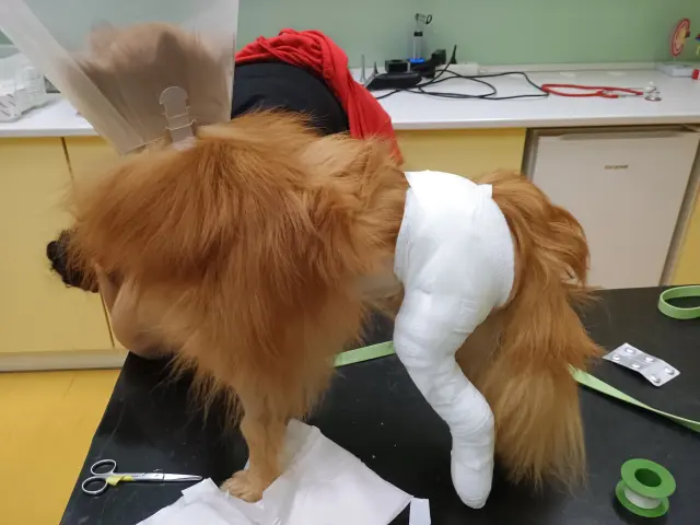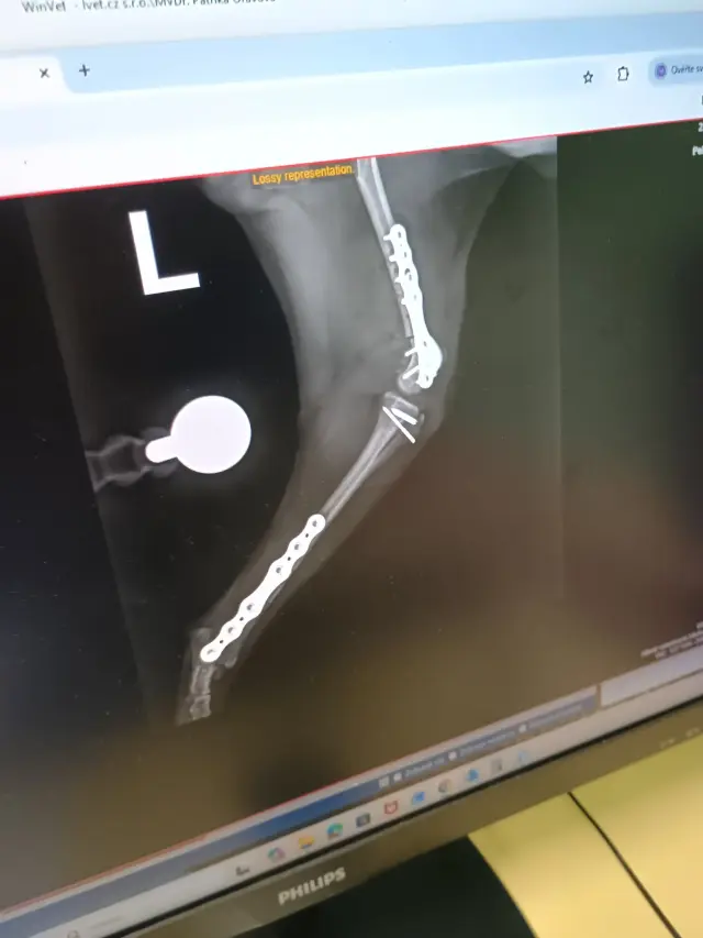 Zároveň  má na jedné z operačních ran komplikaci s hojením – jizva na lýtku je v jedné části nezhojená, otevřená s probíhající osteomyelitidou (zánětem kosti), takže nyní budeme postupovat dle ortopedů v dalším nutném léčení rány. Tím, že jeho nožička je drobná a tenoučká, chybí v místě titanové ploténky vrstva podkoží, která implantát chrání a překrývá. V boudocnu, až operovaná kost sroste, se ploténka bude muset zřejmě vyndat.