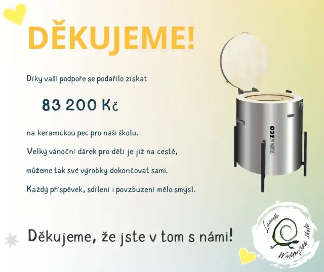 Vybrané prostředky budou použity na zakoupení nové keramické pece pro školní dílnu. Pec bude umístěna přímo ve škole a využívána při hodinách výtvarné a řemeslné výchovy. Každý příspěvek se tak promění v nástroj, který pomůže dětem tvořit, učit se a růst.