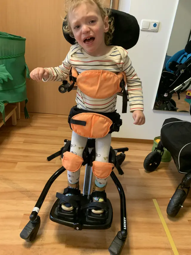 Péče je náročná časově i finančně. Pořídili jsme už speciální židličku, drobné rehabilitační pomůcky, kočárek a nově i vertikální stojan, který mu pomáhá stát a brání zkracování svalů.