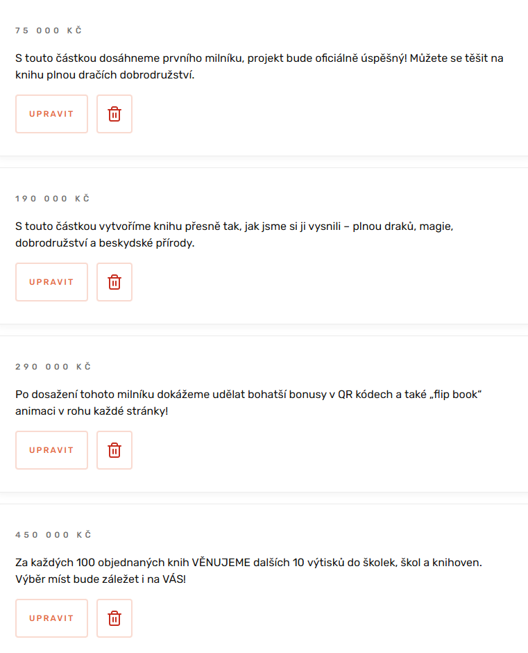 - Máte už název, popis, odměny a vizuální podklady promyšlené? Můžeme přejít na další část přípravy projektu.