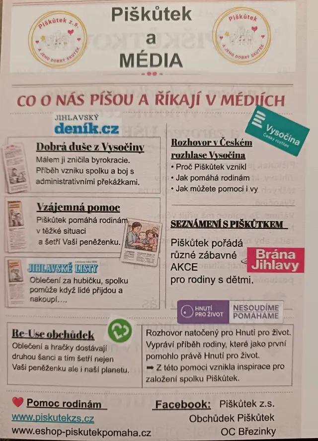 Spolku Piškůtek s úhradou nájmů za obchůdek Antonínův Důl, nájmu na obchodním centru Březinky a úhrady nájmu skladu kde probíhá třízení darů.