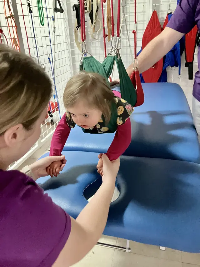 Fyzioterapie posiluje svaly a pomáhá Elince učit se správný pohyb pro stání i první krůčky.