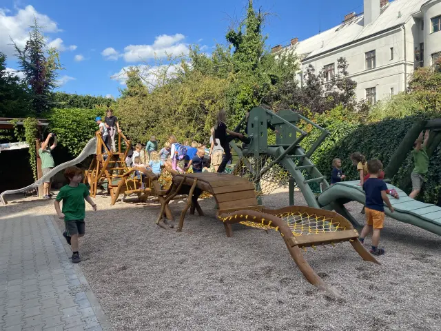 • venkovní hřiště s přírodními herními prvky (dřevěné prolézačky, houpačky a balanční prvky)