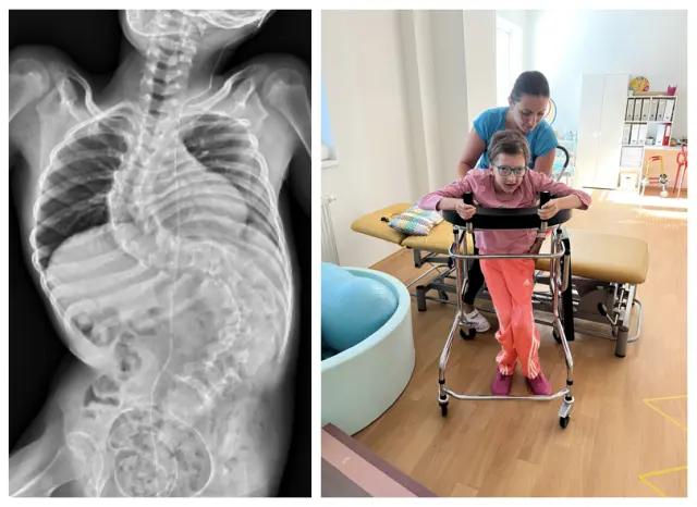 Na fotce je rentgen Ronji ohromné idiopatické skoliózy, která je genetického nebo jiného původu, přesná příčina není u těchto skolióz jasná. Hadička, která prostupuje tělem je vyvedení mozkomíšního moku z VP shuntu, který byl Ronje zavedený krátce po narození.