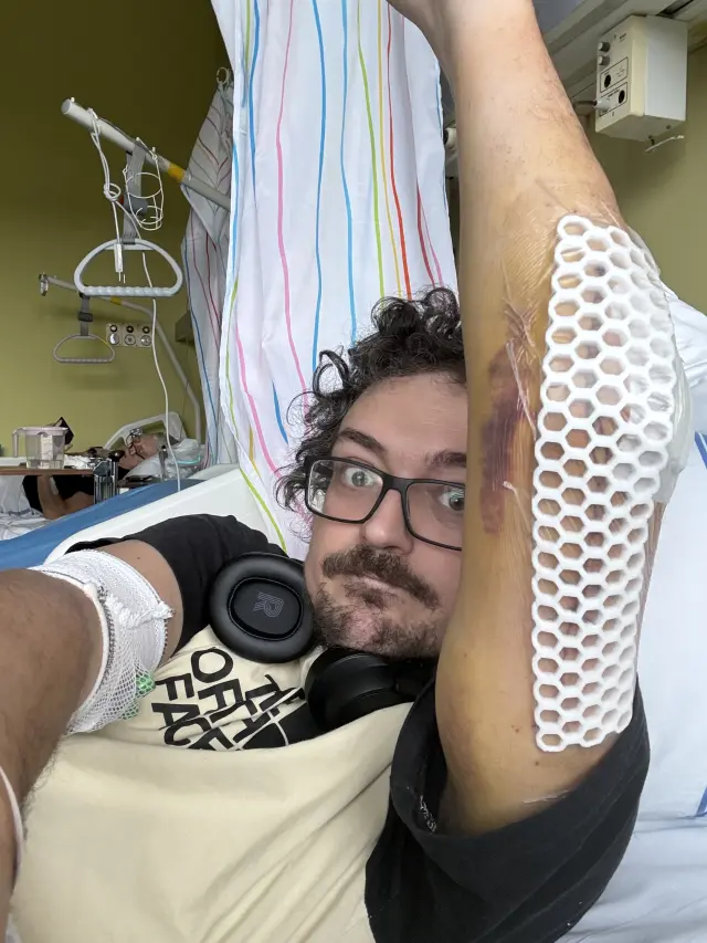 Kromě dolních končetin, Simon utrpěl zranění levé ruky. Jelikož rozsah poškození levého lokte byl tak velký, jediná možnost byla totální náhrada kloubu – endoprotéza.