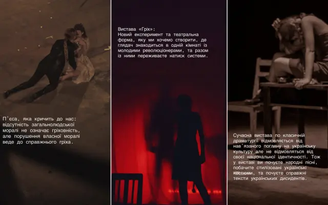 Inscenace vzniká na základě textu spisovatele, disidenta a revolucionáře Volodymyra Vynnyčenka Hřích. Cílem projektu je integrace ukrajinské menšiny a vzdělávání divadelní formou prostřednictvím dramaturgie zaměřené na historické události.