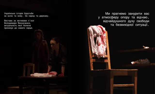Сучасна вистава по класичній драматургії відмовляється від навʼязаного погляну на українську культуру але не відмовляться від своєї національної ідентичності. Тож у виставі ви почуєте народні пісні, побачите стилізовані українські костюми, та почуєте справжні тексти українських дисидентів.