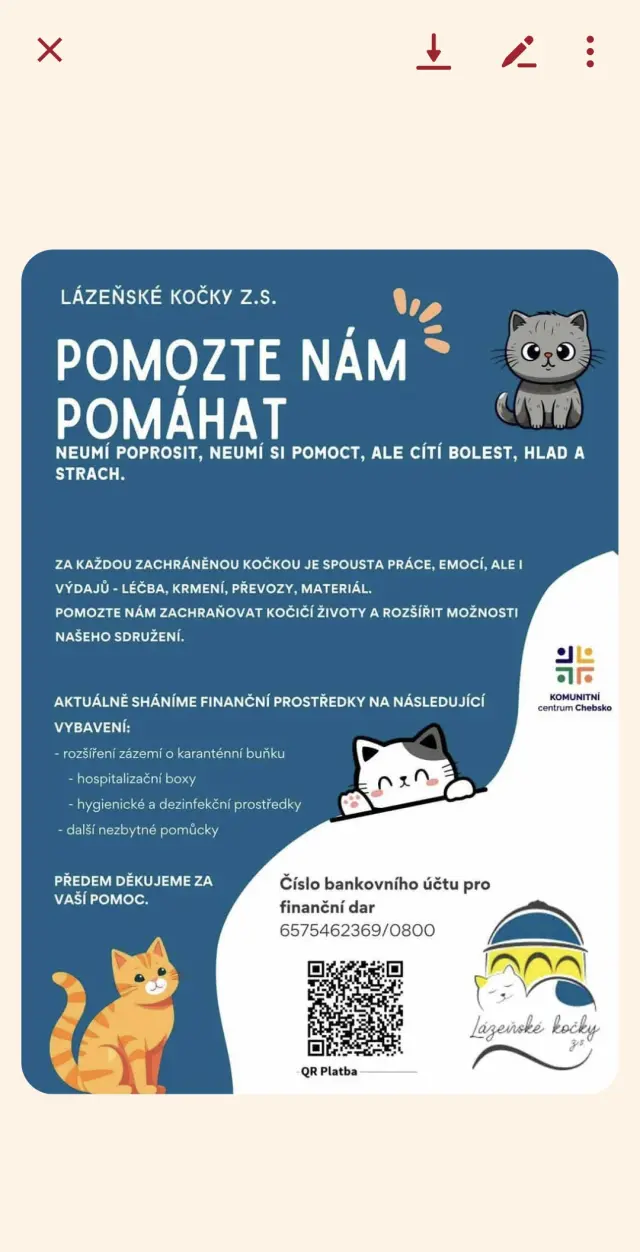 s velkou radostí a vděčností vám oznamujeme, že se nám díky vaší štědrosti podařilo vybrat potřebnou částku na pořízení hospitalizačního boxu pro kočky. Vaše podpora nám umožní zajistit lepší péči o nemocné a zotavující se kočičí pacienty, kteří u nás najdou bezpečné a klidné místo pro uzdravení.