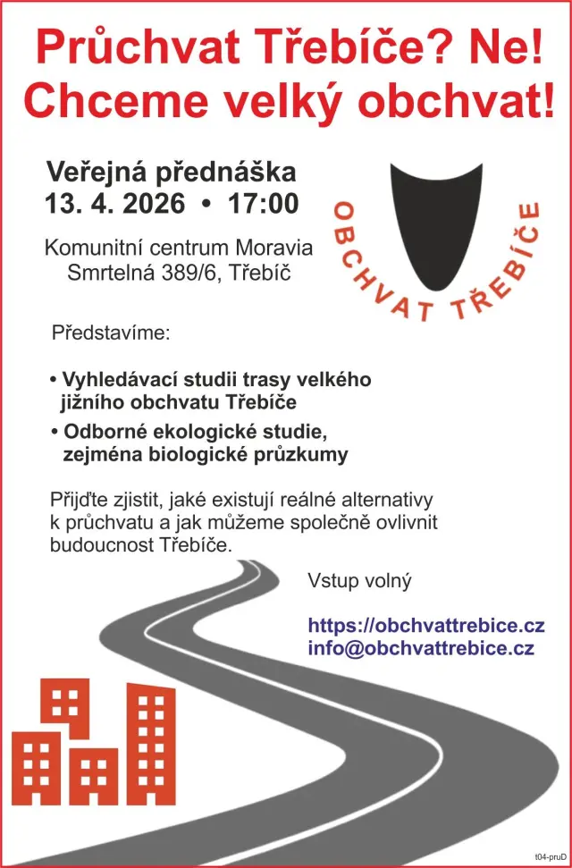 Dovolujeme si upozornit, že v pondělí 13. 4. 2026 proběhne v Třebíči od 17 do 19 hodin v Komunitním centru Moravia (Smrtelná 389/6) veřejná beseda o výhodách velkého obchvatu Třebíče délky asi 12 km jako alternativa k plánu realizovat nový průtah městem (tzv. průchvat) délky asi 6 km.