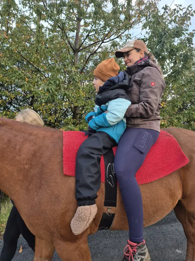 Teo včera na koni opět seděl obkročmo, jako posledně a byl si v tom více jistý. Co jsem nečekala (že přijde tak brzy) bylo, že bez větších potíží udržel hlavu, krk i trup v napřímení téměř sám a za jízdy po dobu asi 10 vteřin. To je veliká věc, není to drobnost. Zajímavé bylo rovněž zjištění, že čím déle jezdili…tím se Teímu lépe dařilo dostat tělo pod vědomou kontrolu. Dokonce i s levou spastickou nohou šel do krásného fyziologického (normálního) propojení s trupem, krkem a hlavou. Sice 10 vteřin, ale takto to začíná.