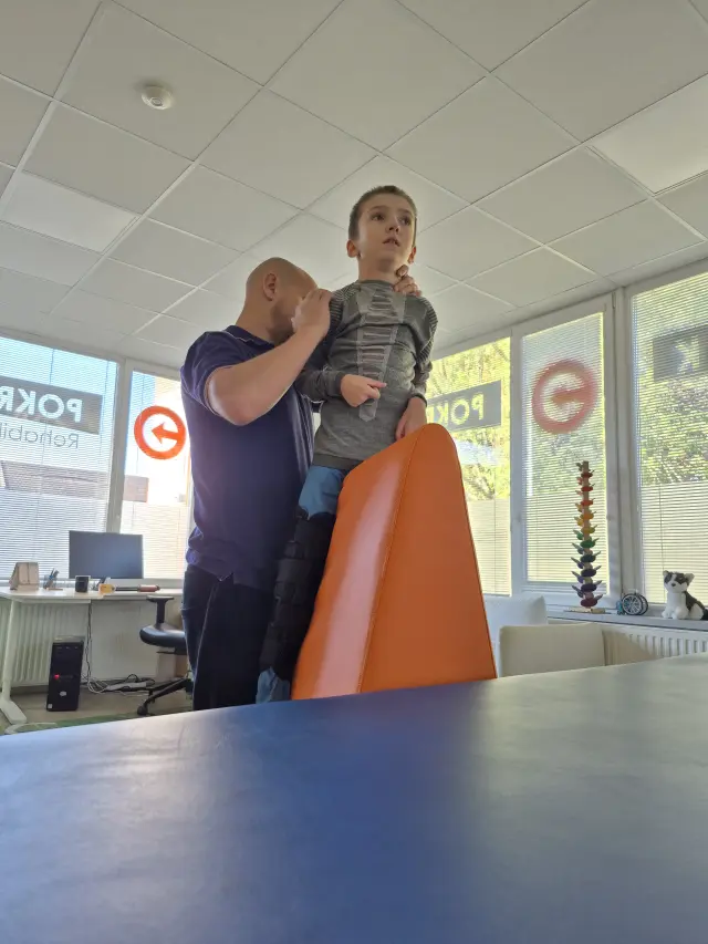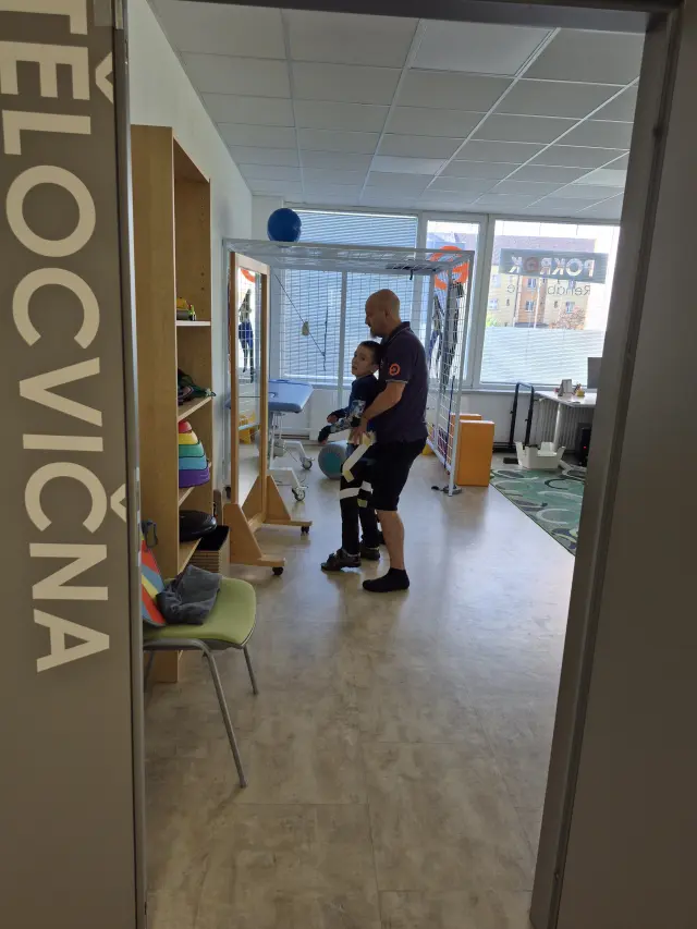 Dnes udělal opět posun na rehabilitaci. Více ovládá některé svaly trupu vsedě i ve stoje.